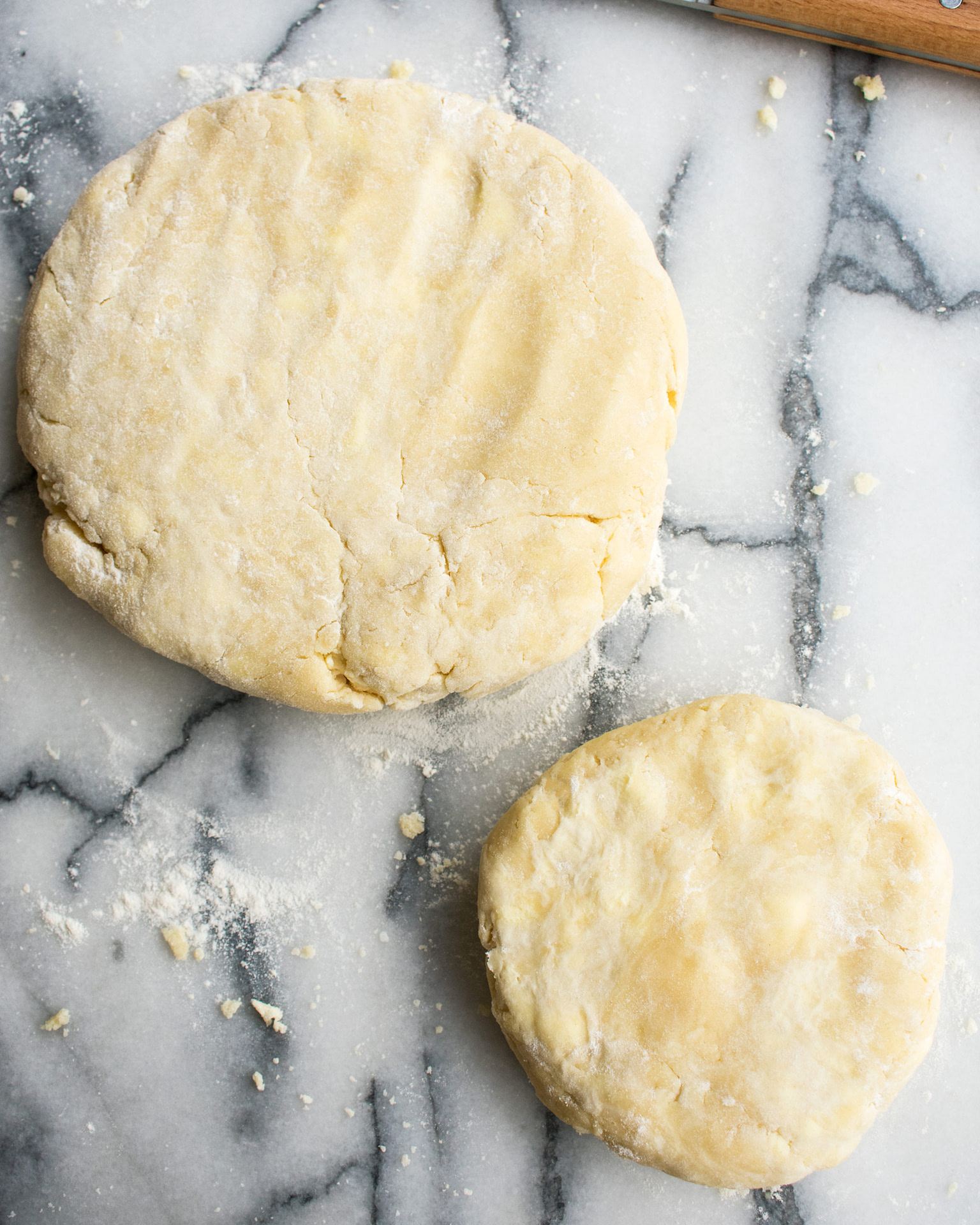 - Roughly shape the dough into a ball. Use a knife to divide the dough into ¾ and ¼ portions. Shape each portion of dough into a round, flat disk. Wrap with plastic wrap and chill for 1 hour in the fridge.