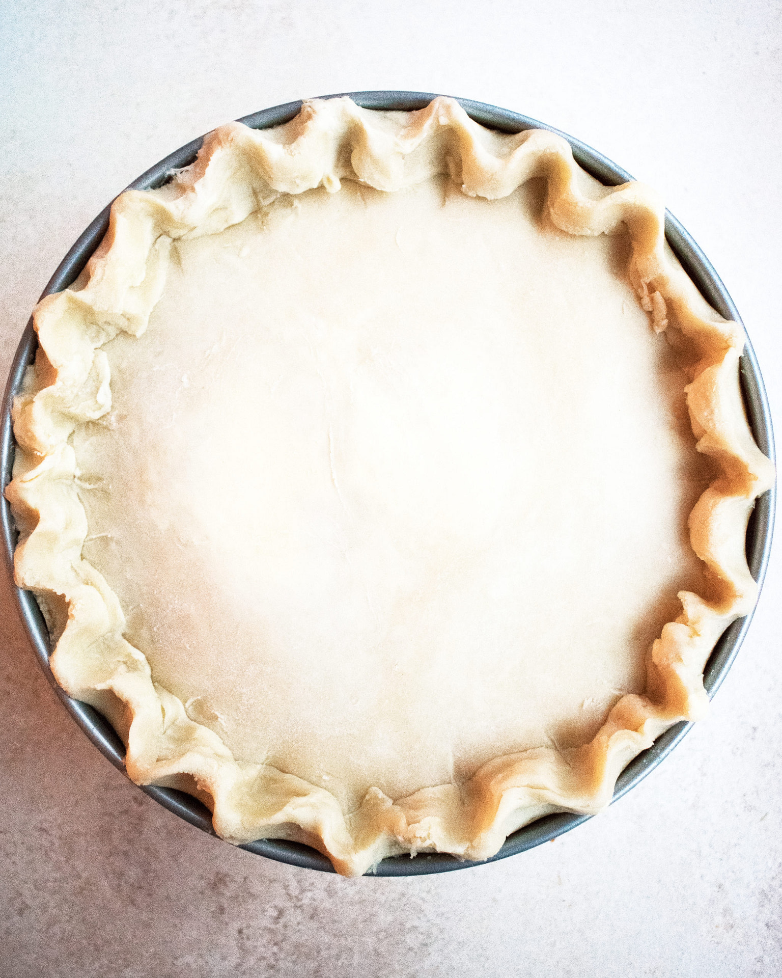 - Remove the smaller portion of pie dough from the fridge and transfer it to a lightly floured surface. Use a rolling pin to roll the dough into a thin sheet, about 1/8” thick. Lay the dough on top of the pie, with the excess hanging over the edge of the pan. Use a paring knife to trim both layers of dough so that they lay evenly right over the edge.