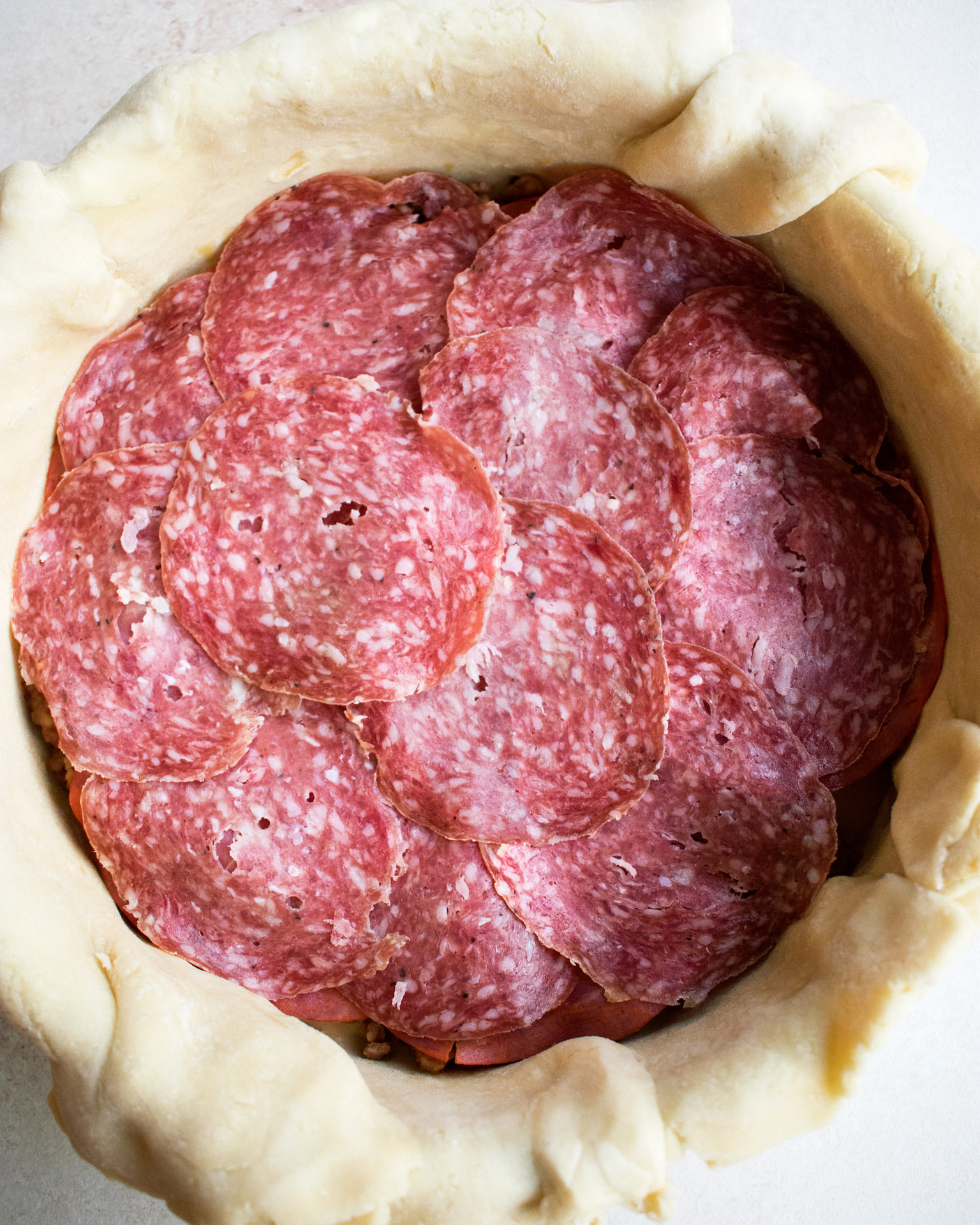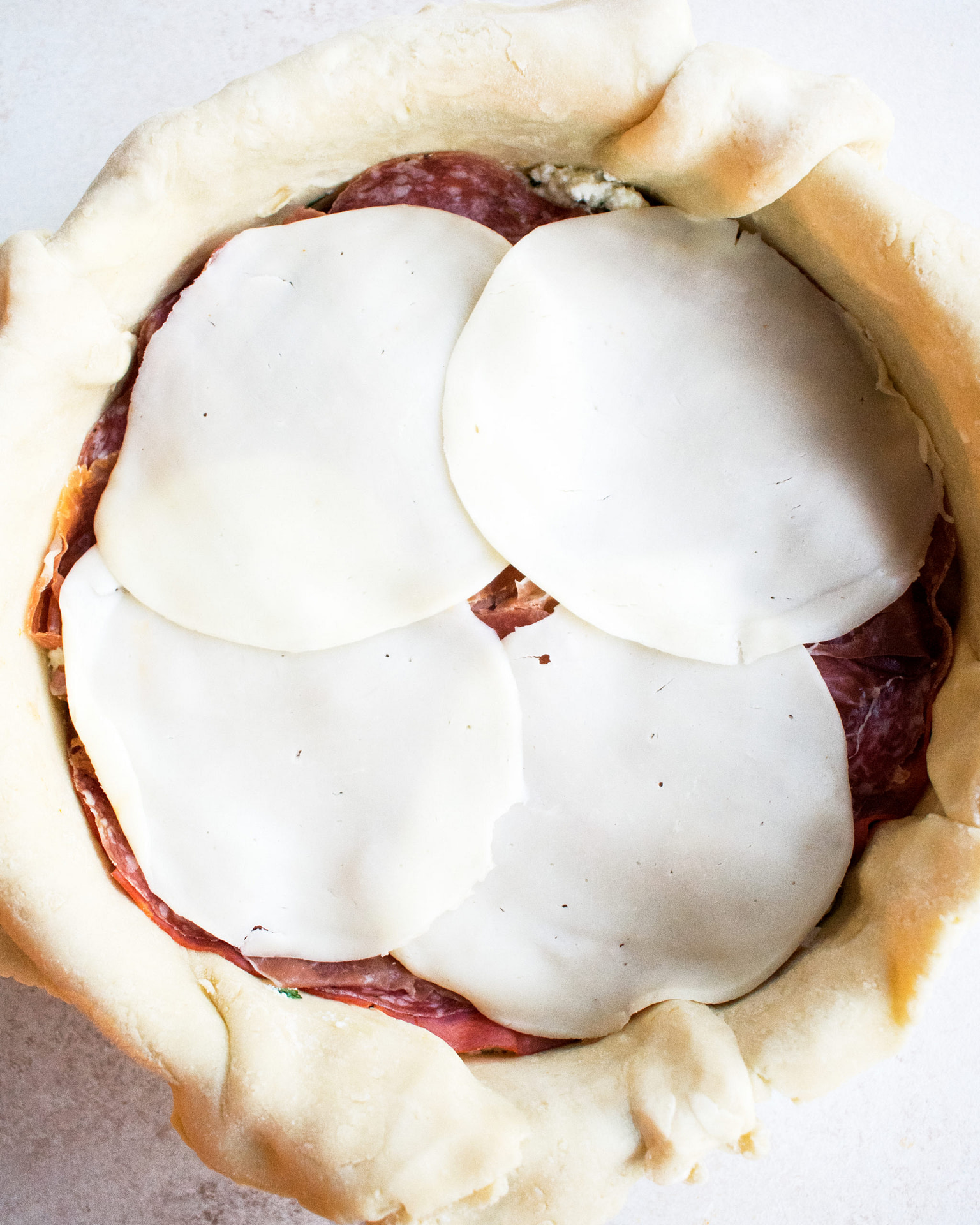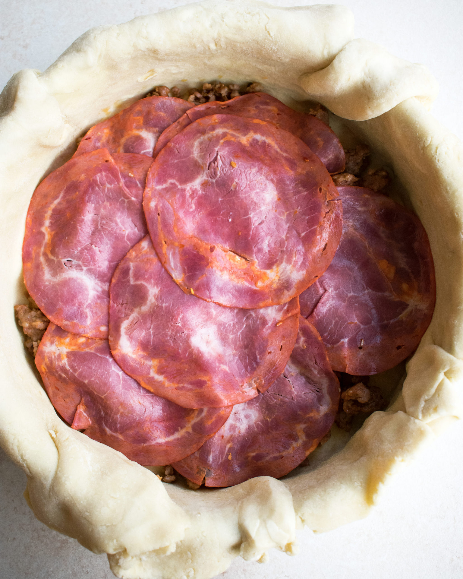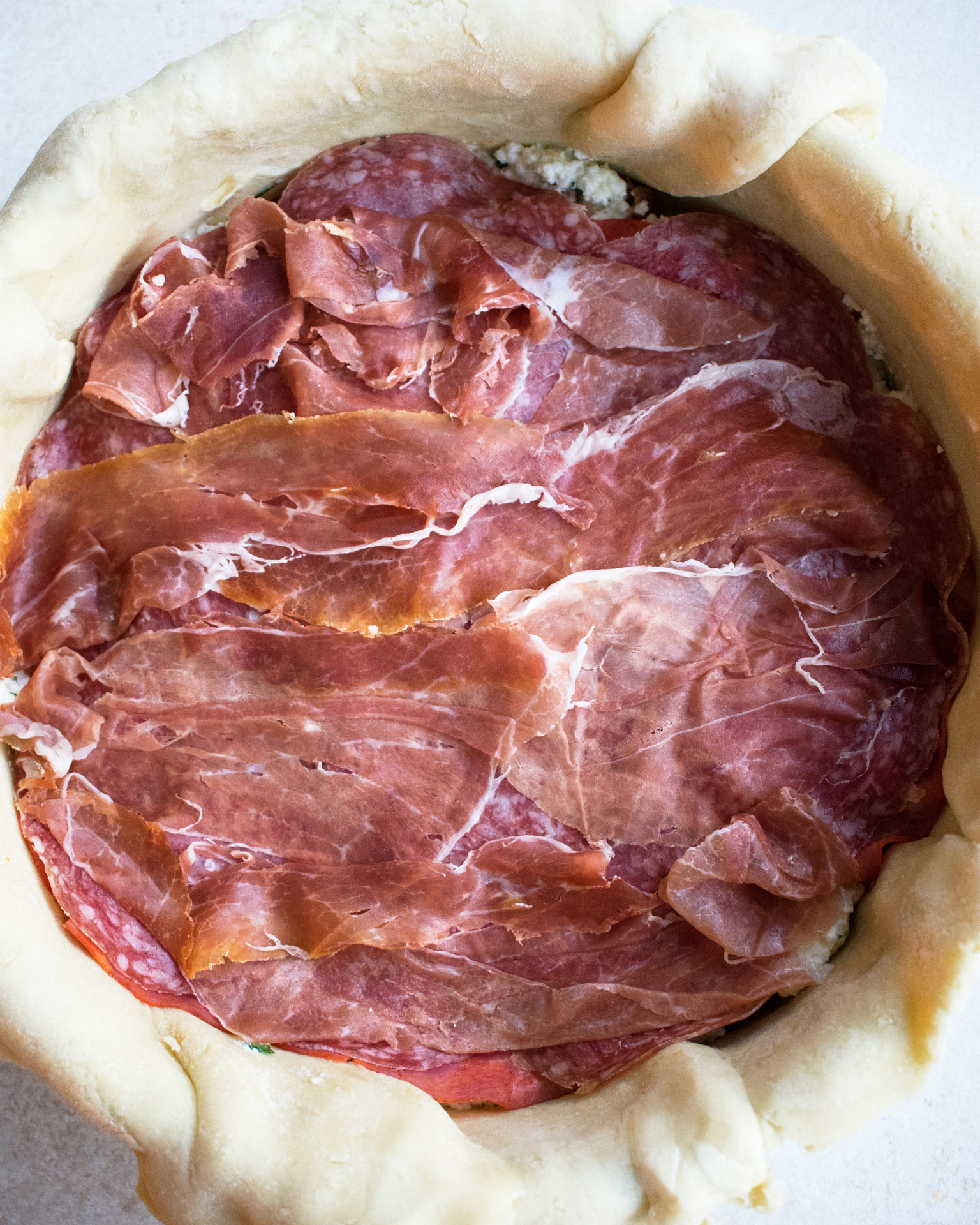 - Remove the prepared pan from the fridge. Layer the pie as follows: ½ of the sausage, 1/3 of the ricotta filling, capicola, salami, ½ of the prosciutto, provolone, 1/3 of the ricotta mixture, spinach, ½ of the sausage, ½ of the prosciutto, 1/3 of the ricotta mixture.