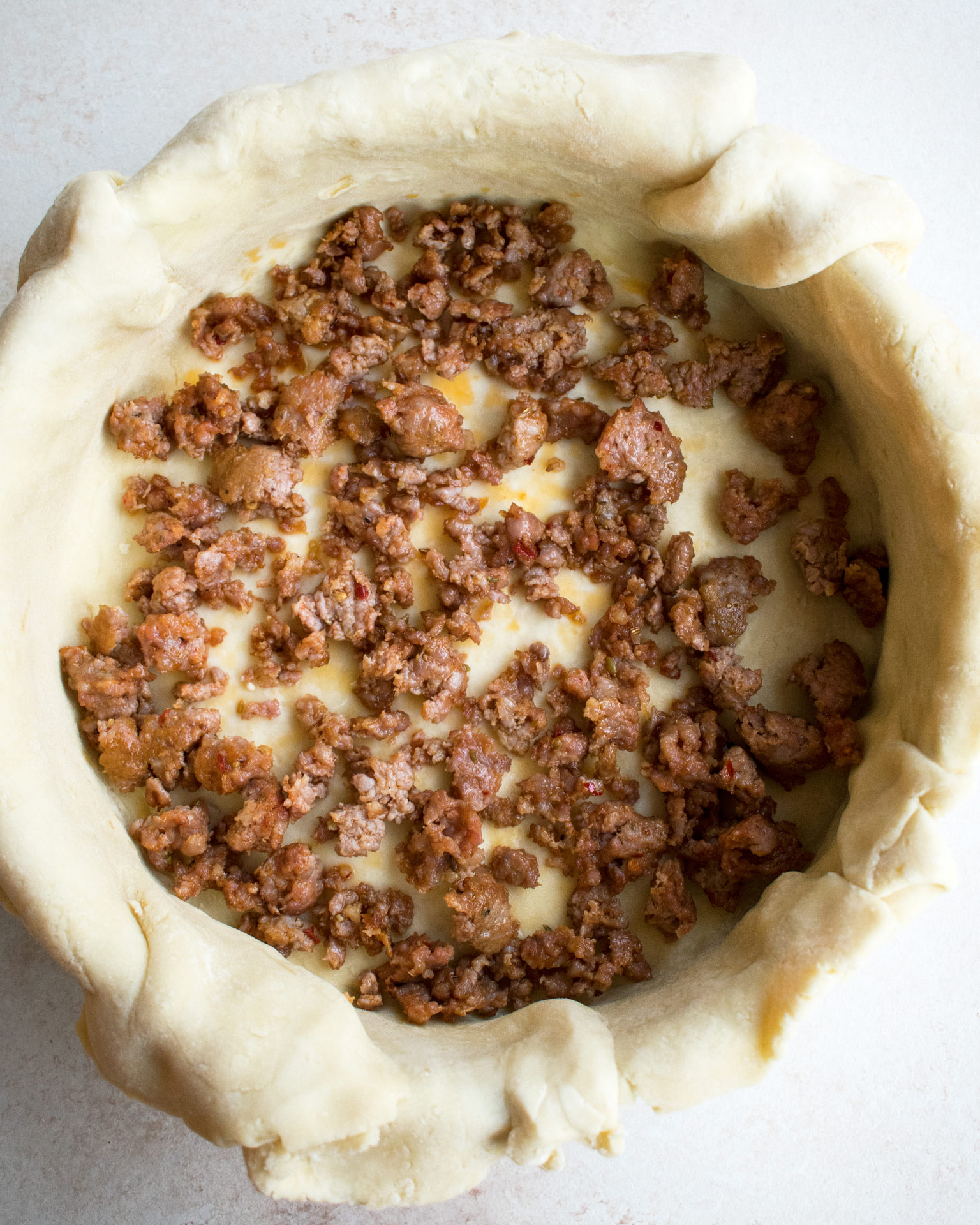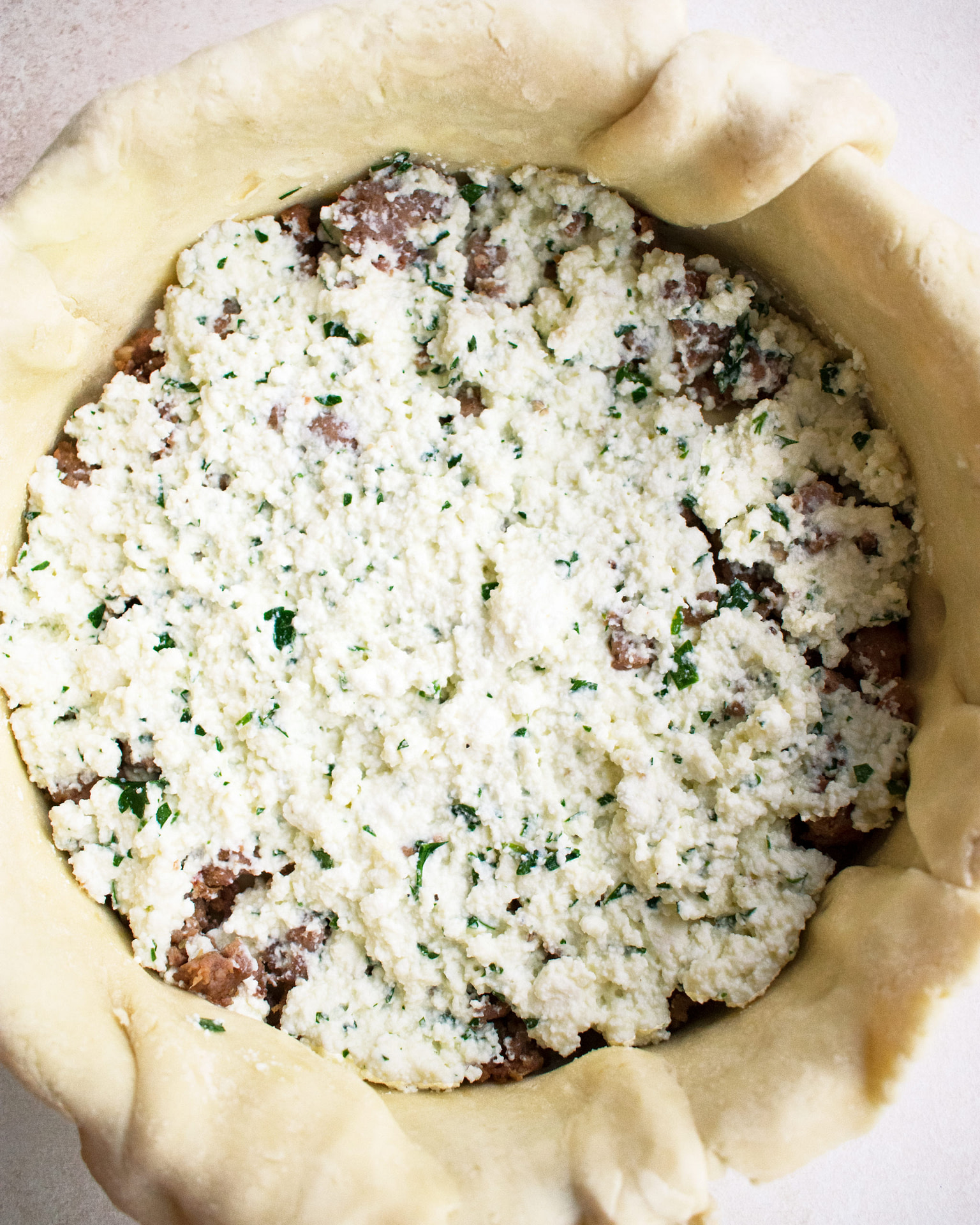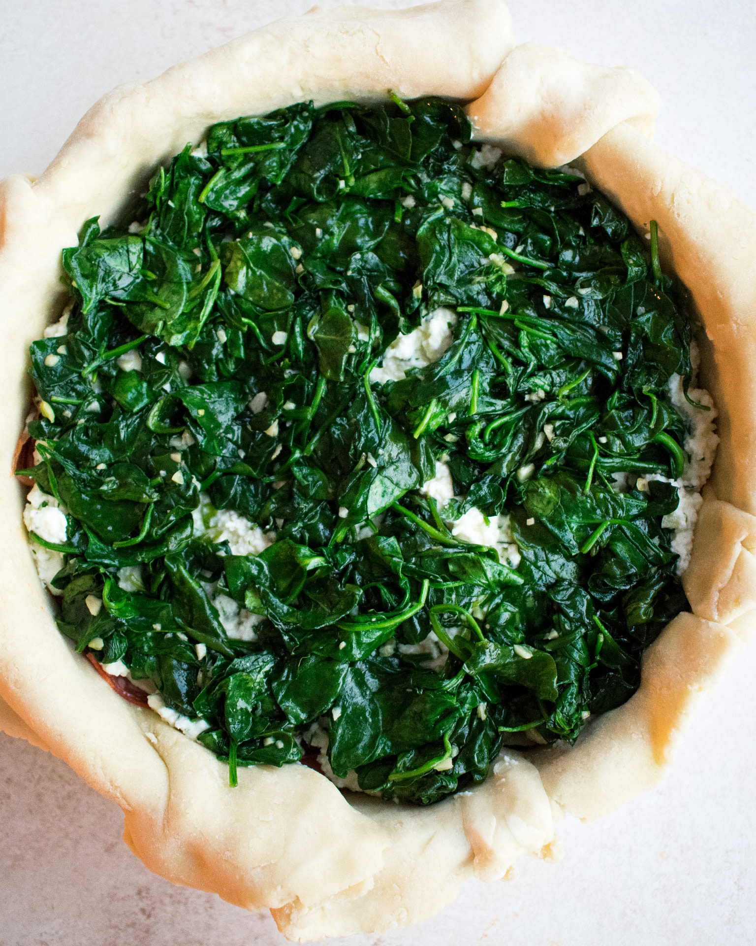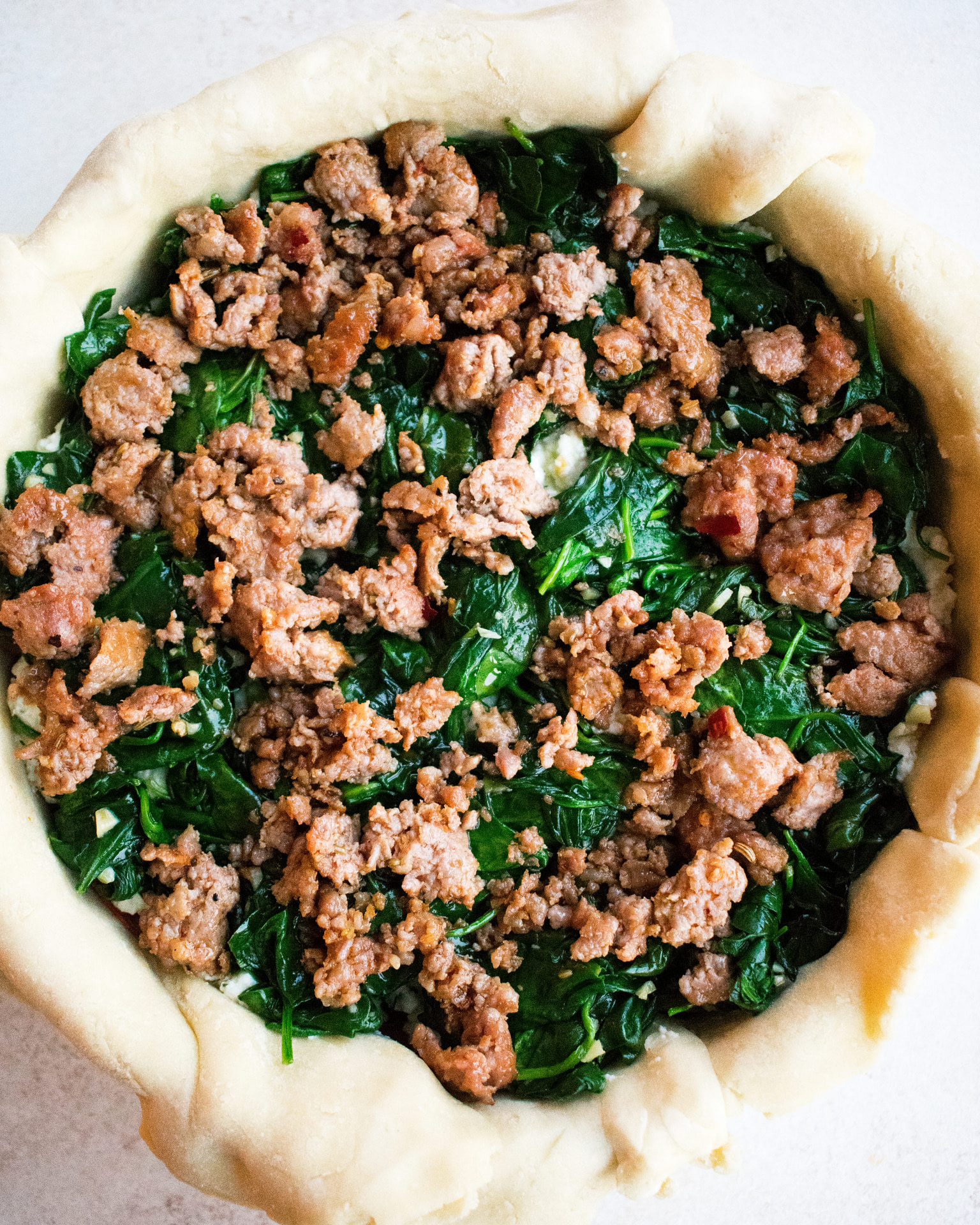 - Remove the prepared pan from the fridge. Layer the pie as follows: ½ of the sausage, 1/3 of the ricotta filling, capicola, salami, ½ of the prosciutto, provolone, 1/3 of the ricotta mixture, spinach, ½ of the sausage, ½ of the prosciutto, 1/3 of the ricotta mixture.